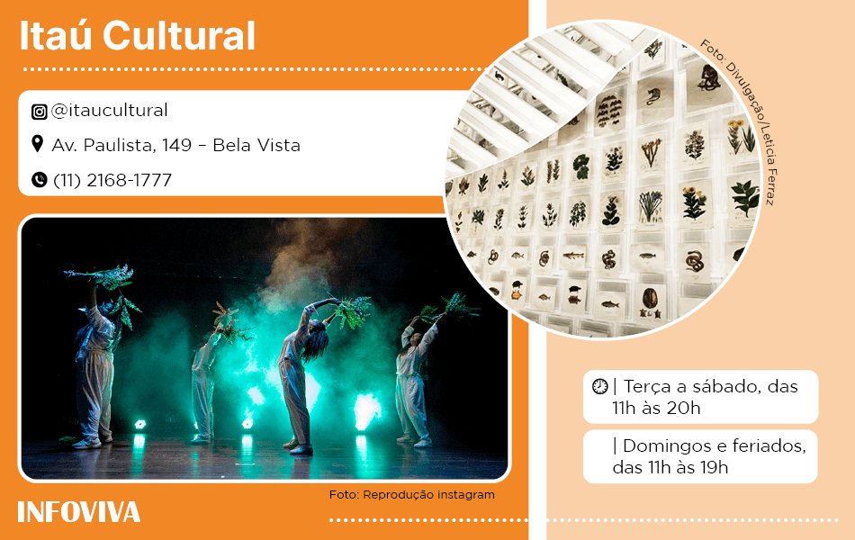 O Itaú Cultural oferece uma ampla agenda de eventos, com exposições, shows, oficinas e peças de teatro. A programação abrange diversas manifestações artísticas e culturais, com atividades no próprio instituto e em instituições parceiras, no Brasil e no exterior.